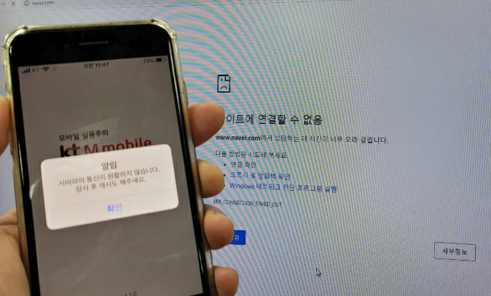 KT 인터넷망이 25일 오전 11시 20분쯤 인터넷 연결이 끊어진 모바일과 PC화면. 연합뉴스