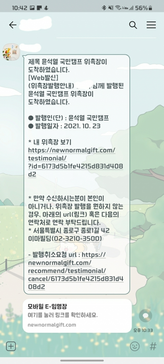 ‘어처구니가··· 초6 딸내미한테 임명장 왔네요’라는 제목의 글이 23일 한 온라인 커뮤니티에 올라왔다. 해당 게시글엔 특정 인터넷 주소(링크)가 적힌 카카오톡 메시지를 캡처한 사진이 첨부돼 있다. 메시지 속 링크를 클릭하면 윤 전 총장 명의로 발급된 모바일 위촉장이 나오는 구조다.