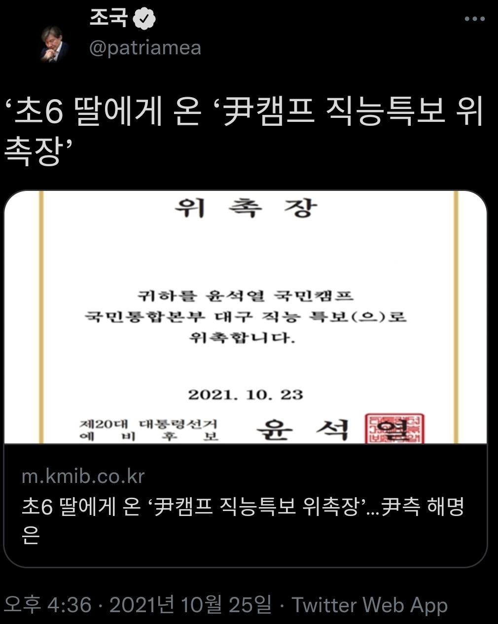 초6 딸에게 온 ‘尹캠프 직능특보 위촉장’…尹측 해명은 최근 코로나19 상황 고려해 각종 위촉장 등을 온라인 발송 캠프에서 정리할 때 오류 발생 조국 트위터 날려 나름 정치일선