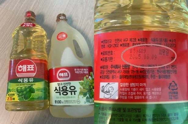 공개된 사진 속 식용유는 같은 브랜드 제품이지만, 패키지는 달랐다. 그중 1개의 식용유 뒷면에는 ‘유통기한 2005년 6월 9일’ ‘브랜드 파워 식용유, 2000~2003년 4년 연속’이라고 적혀 있었다.