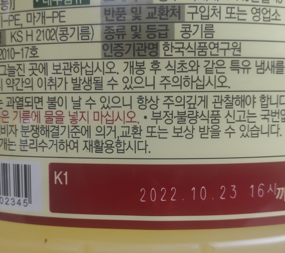집에 있는 다른 회사 식용유 라벨을 찍어봤다. 큰 혐의점을 볼 수는 없지만, 작위적이지 않을 수 없는 사건이다.