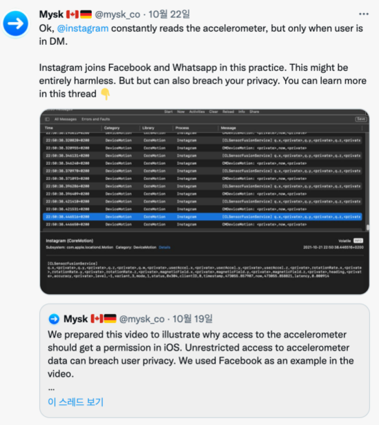 보안 연구원인 토미 미스크(Tommy Mysk)는 "가속도계 데이터는 무해한 것처럼 보이지만 앱이 이러한 측정을 구성한다는 것은 놀라운 사실이다"라며 "앱은 사용자의 심박수, 움직임, 그리고 심지어 정확한 위치 등 개인의 은밀한 정보까지 알아낼 수 있다"고 지적했다.