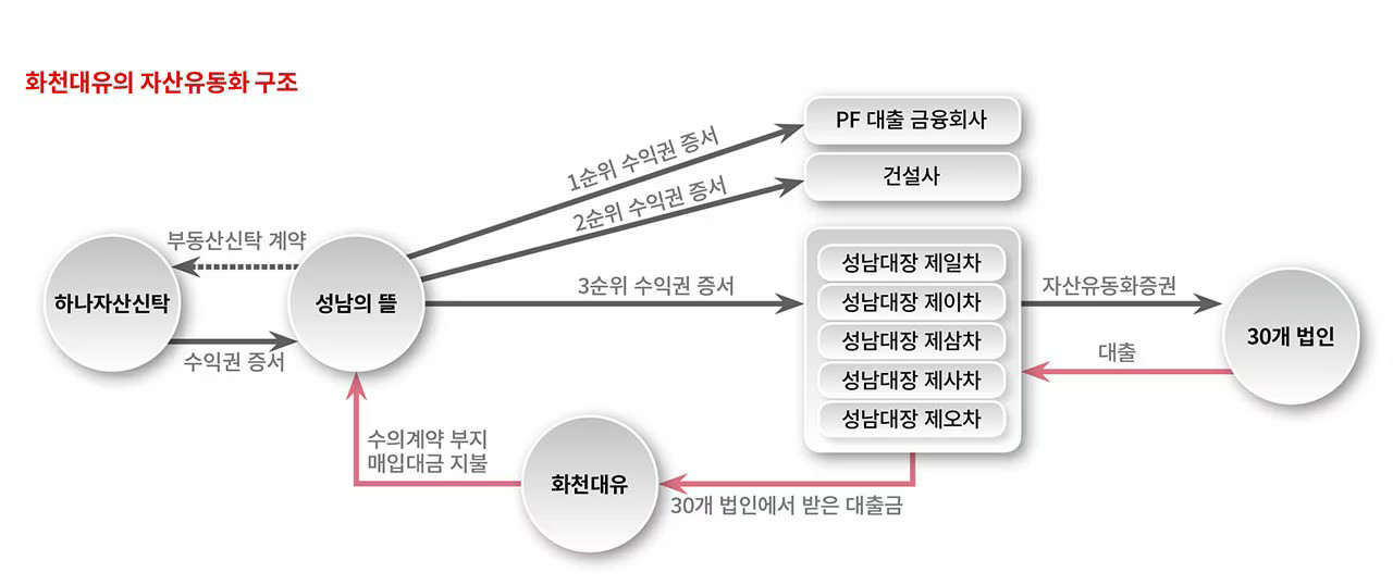 성남대장 제일차~제오차는 화천대유로부터 받은 수익권증서(정확하게는 수익권증서를 기초자산으로 하는 유동화 상품)를 2017~2018년 총 30곳의 금융기관 및 또 다른 SPC들에게 담보로 주고 총 5324억원을 빌렸다. 그리고 이 돈이 다시 화천대유로 대출되어 수의계약 5개 구역 매입금으로 사용됐다.
