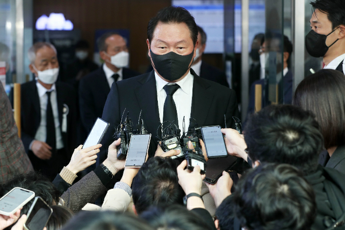 최태원 SK 회장이 27일 서울 종로구 서울대병원 장례식장에 마련된 고 노태우 전 대통령의 빈소를 찾아 조문을 마친 뒤 취재진 질문에 답하고 있다. 사진공동취재단