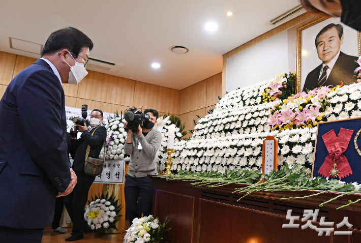 고(故) 노태우 전 대통령의 빈소가 서울대병원 장례식장에 마련됐다. 27일 빈소를 찾은 박병석 국회의장이 조문을 하고 있다. 사진공동취재단