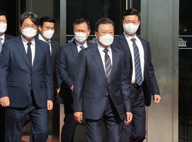 문재인 대통령이 25일 오전 국회 본회의장에서 2022년도 예산안 시정연설을 마친 뒤 본관에서 나오고 있다. /뉴시스