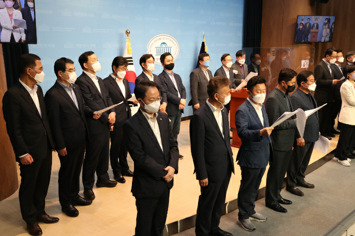 더불어민주당 이낙연 캠프 홍영표 공동선대위원장 등 소속 의원들. 윤창원 기자