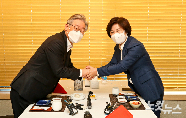 더불어민주당 이재명 대선 후보와 추미애 전 법무부 장관이 지난 27일 서울 여의도의 한 식당에서 열리는 오찬 회동 중 악수하고 있다. 국회사진취재단