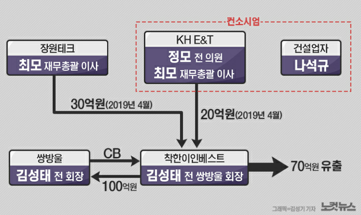 이렇게 화천대유 김만배씨로부터 뻗어나간 돈 109억원에 깊숙이 연루된 나석규씨는 대양금속을 중심으로 한 쌍방울그룹과의 자금 흐름에도 또 한차례 등장한다. 나씨에 앞서 KH E&T라는 회사가 먼저 대양금속을 사들이려고 컨소시엄을 설립했는데, KH E&T는 바로 쌍방울의 페이퍼컴퍼니이자 비자금 저수지로 지목된 착한이인베스트에 20억원을 대여한 곳이다. 빌려준 시기는 김만배씨가 이기성 대표에게 109억원을 송금한 2019년 4월과 겹친다.