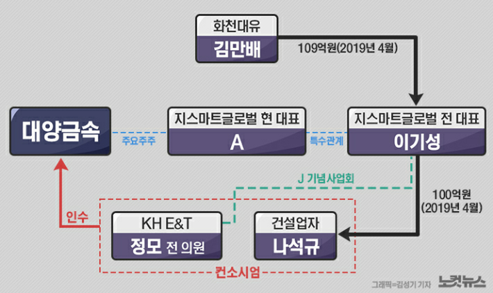 이기성 대표에게서 100억원을 받고 8개월쯤 지난 2019년 12월말, 나석규씨는 수십억원을 들여 상장사인 대양금속 인수에 뛰어들었다. 겉으로는 이 대표와 상관없는 거래로 보이지만 실상은 달랐다. 대양금속의 주요주주이자 대표이사 직함을 쓴 인물로 A씨가 있었는데, A씨와 이 대표는 사업적으로 밀접하게 묶인 특수 관계였던 것이다. 이기성 대표는 2018년 12월까지 유리제조업체 지스마트글로벌의 대표이사를 지낸 뒤 같은 그룹 관계사 대표로 자리를 옮겼는데, 이 대표 후임으로 새로 취임한 대표가 바로 A씨다.
