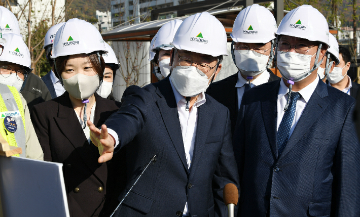 더불어민주당 이재명 대선후보가 29일 경기도 성남 수정구 신흥동 성남 제1공단 근린공원 조성공사 현장을 둘러보며 참석한 의원들과 대화하고 있다. 연합뉴스