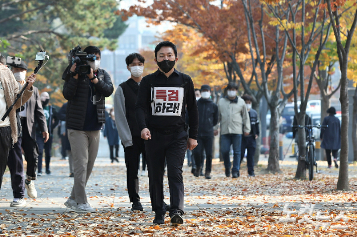 대장동 의혹 특검 수용을 촉구하며 1인 도보 시위에 나선 국민의힘 원희룡 대선 경선 후보가 2일 오전 경기도 성남 분당구 성남시청 앞을 지나고 있다. 국회사진취재단