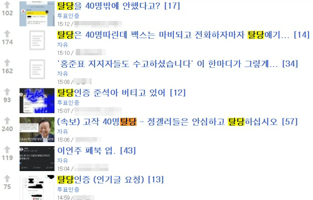 최근 국민의힘 홈페이지 게시판과 온라인 커뮤니티 등에는 경선 결과를 두고 갑론을박이 이어지고 있다. 자신을 홍 의원 지지자라고 밝히는 이들이 국민의힘을 ‘노인의힘’ ‘구태의힘’ ‘도로한국당’ 등으로 표현하며, 자신들의 탈당 신고서를 인증하는 것이다. 이들은 50대 이상 당원들이 당원 투표에서 윤 후보에게 지지를 몰아주면서, 2030세대가 지지하는 홍 의원이 낙마했다고 주장한다.