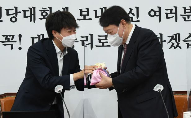 국민의힘 윤석열 대선 후보가 2021년 11월 8일 국회에서 열린 최고위원회의에 참석 이준석 대표로부터 선거에 도움을 주는 복주머니를 선물 받고 있다./남강호 기자