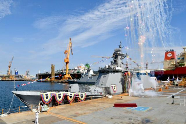 해군의 신형호위함 6번함인 ‘포항함’이 9월 경남 거제 대우조선해양 옥포조선소에서 진수되고 있다. 군이 천안함 재단과 유족의 요청에 따라 ‘천안함’으로 명명한 7번함은 9일 울산 현대중공업에서 진수식을 갖는다. 해군 제공