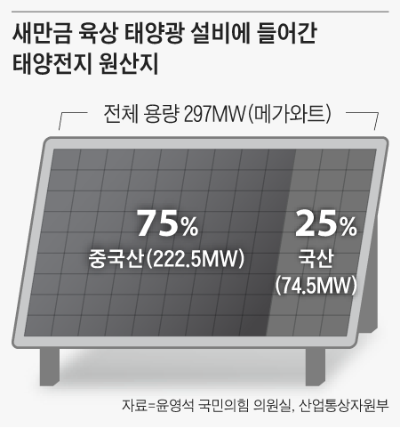 8일 국민의힘 윤영석 의원이 공개한 ‘새만금 육상 태양광 1~3구역 모듈 원산지 내역’에 따르면, 새만금 육상 태양광(297㎿)에는 모듈을 구성하는 태양광 셀이 중국산 222.5㎿, 국산은 74.5㎿가 쓰인 것으로 나타났다. 태양광 모듈 66만5000장 중 50만장이 중국산 셀로, 전체의 75%에 이른다.