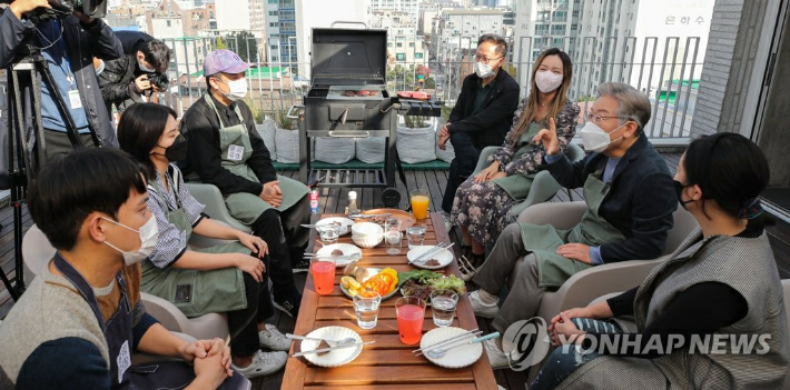 더불어민주당 이재명 대선 후보가 6일 오전 서울 동대문구 청년주택 '장안생활' 테라스에서 청년들과 대화하고 있다.