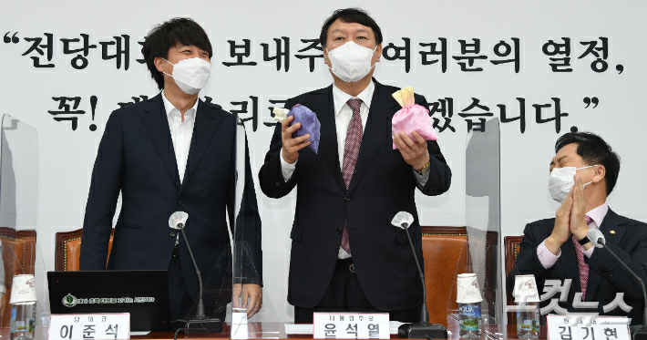 국민의힘 윤석열 대선 후보가 8일 국회에서 열린 최고위원회의에 참석해 이준석 대표로부터 '선거에 도움이 된다'는 복주머니를 전달받고 있다. 윤창원 기자