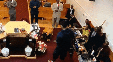 현지 신자가 공개한 영상 중 일부. 영상의 오른쪽에서 빨간색 마이크을 들고 검은색 계열의 정장을 입은 은디쿠마나 목사가 움직이는 모습이 보인다. 그는 뒤쪽으로 가는 척 하면서 사각지대를 찾았고, 결국 총을 든 남성을 제압하는데 성공했다. /유튜브