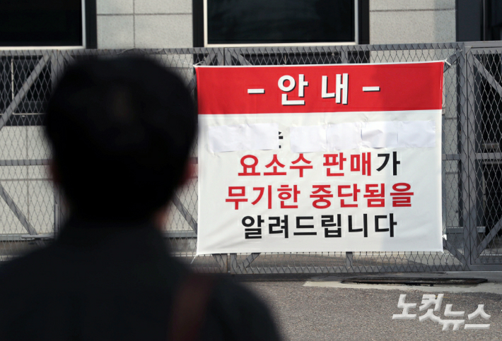 경유 차량 운행에 반드시 필요한 '요소수' 의 품귀 현상이 갈수록 심해지는 가운데 4일 한 시민이 요소수를 구입하기 위해 경기도 부천 한 요소수 제조 공장에서 판매중단 안내문을 확인 후 발길을 돌리고 있다. 황진환 기자