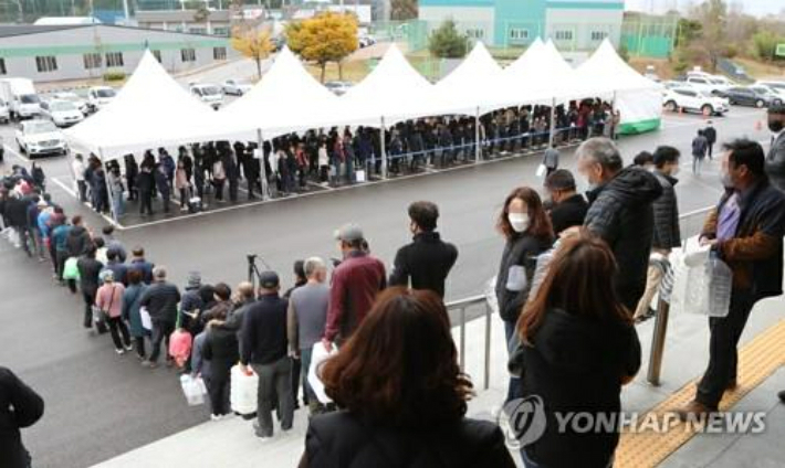 9일 전북 익산시 실내체육관 앞에 요소수를 구매하려는 인파가 몰려 있다. 전북 익산시와 호남 유일의 요소수 생산업체인 아톤산업은 이날부터 지역민에게 요소수를 직접 판매하기로 했다. 토·일요일·공휴일을 제외한 평일 오전 10시부터 오후 4시까지 요소수를 판매한다.