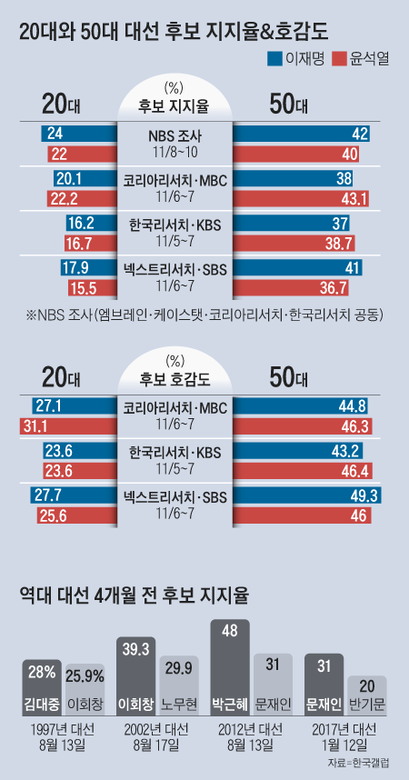 20대와 50대는 두 후보에 대한 호감도 역시 비슷했다. 넥스트리서치·SBS 조사(11월 6~7일)에서 후보별 호감도는 이 후보가 40대(56.3% 대 30.5%)와 30대(34.8% 대 28.8%)에서 우세했고, 윤 후보는 60대 이상(66.4% 대 26.5%)에서 앞섰다. 하지만 20대(27.7% 대 25.6%)와 50대(49.3% 대 46.0%)에서 비슷했다. 특히 20대에선 비호감도가 이 후보(71.7%) 윤 후보(72.8%) 모두 비슷하게 높아서 앞으로도 쉽게 어느 쪽으로 기울어지기 어려울 것으로 예측됐다.