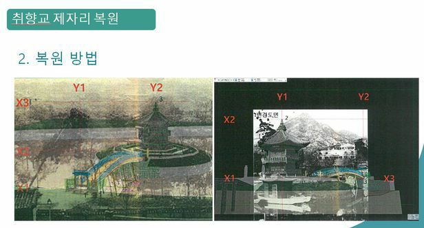문화재청의 향원정 복원 사업 설명자료 중 옛 사진을 통한 취향교의 3D 모델링에 대해 설명한 부분. /문화재청