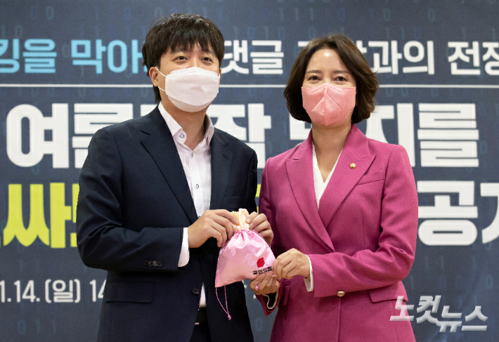 이준석 국민의힘 대표(왼쪽)와 이영 디지털정당위원장이 14일 국회 의원회관 제2소회의실에서 열린 '20대 대선 여론조작 방지를 위한 온라인 싸드, 크라켄 공개'행사에서 비단주머니를 들고 기념촬영을 하고 있다. 국회사진취재단