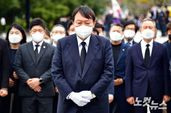 윤석열 국민의힘 대선후보가 11일 오후 경남 김해시 봉하마을을 찾아 고 노무현 전 대통령 묘역에 참배를 하고 있다. 윤창원 기자