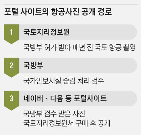 카카오와 네이버 등이 제공하는 지도 서비스에서 확인할 수 있는 항공사진은 포털 사이트가 자체 생산하는 자료가 아니다. 국토교통부 산하 국토지리정보원(이하 정보원)이 국방부 허가를 받아 매년 1차례 정기적으로 국토 촬영용 항공기를 띄워 항공사진을 촬영하고, 정보원은 국방부의 검수를 받는다. 국가안보 시설의 외부 노출을 막기 위한 절차다. 정보원은 이후 항공사진에서 안보 시설 모습을 숨김 처리하고, 포털 사이트는 이 사진을 구입해 지도 서비스에 활용한다.