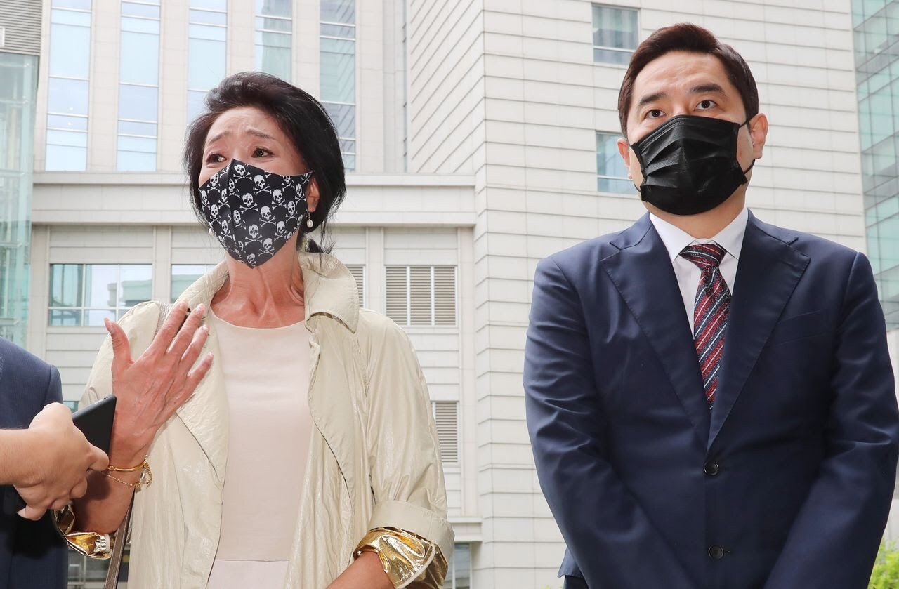 이재명 경기도지사에게 허언증 환자로 몰렸다며 손해배상 청구 소송을 제기한 배우 김부선씨가 8월 25일 오후 서울동부지법에서 열린 3차 변론기일에 출석하며 취재진의 질문에 답하고 있다. 사진 오른쪽은 김씨 측 강용석 변호사. /연합뉴스