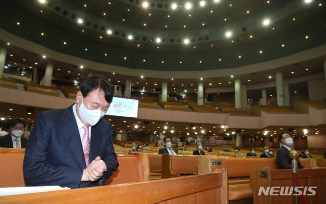 윤석열 국민의힘 대선후보는 21일 서울 서초구 사랑의교회를 찾아 예배를 드렸다. 지난달 경선 당시 무속 논란에 휩싸인 이후 순복음 교회를 찾은 뒤 두번째 교회방문이다.