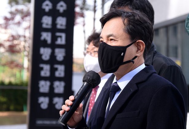 김진태 국민의힘 이재명 비리 국민검증특위 위원장이 17일 경기도 수원시 수원지방검찰청 후문 앞에서 더불어민주당 이재명 대선 후보 '변호사비 대납 의혹' 수사와 관련해 발언을 하고 있다 /뉴시스