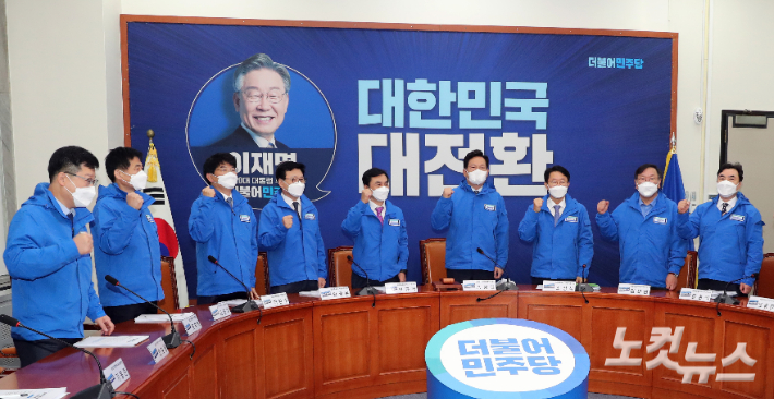 더불어민주당 송영길 상임선대위원장 등 지도부가 12일 오전 국회에서 열린 선대위 총괄본부장단 회의에서 구호를 외치고 있다. 윤창원 기자