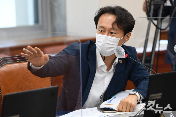 이탄희 더불어민주당 의원이 10월 1일 오전 서울 여의도 국회 교육위원회에서 열린 교육부 국사편찬위원회 등에 대한 국정감사에서 의사진행발언을 하고 있다. 윤창원 기자