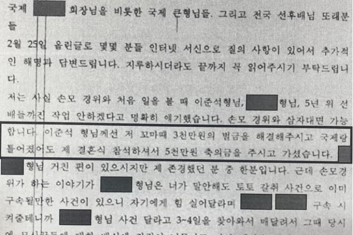 그러면서도 "그 편지 내용을 보니 오히려 심증이 굳어진다. 이준석은 박철민을 모른다고 했는데, 두 사람이 모르는 사이라고 할 수 없을 만큼 내용이 구체적이고 생생하다"며 "이준석 말대로라면 박철민은 모르는 사람에게 편지를 보내, 주지도 않은 5천만원을 주셔서 고맙다는 말을 했다는 거다. 상식적이지 않다"고 또 다른 의혹을 제기했다.