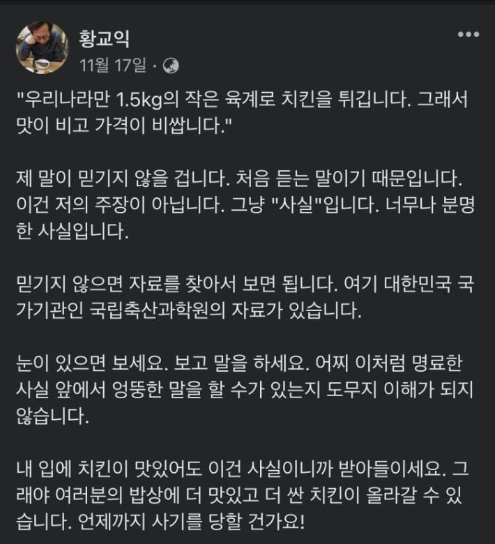 황교익-양계협회 라디오 설전 맛없다 vs 자격 없다 정부 연구결과닭 클수록 가성비 좋고 맛 성분 풍부 육계회사 병아리‧사료 더 많이 팔아 이득남겨 치킨 2.5kg, 3kg짜리 닭 값이 600원