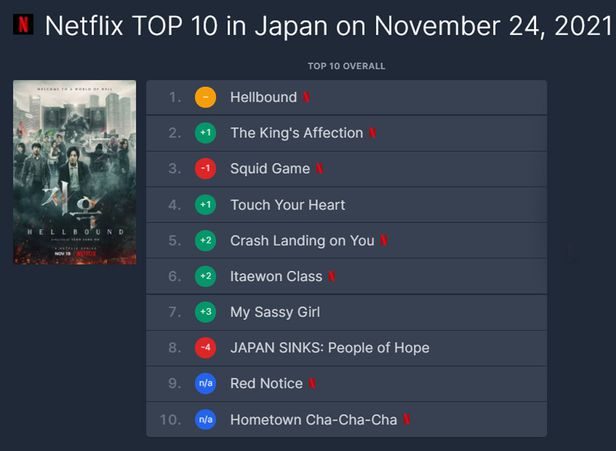 콘텐츠 통계 사이트 플릭스패트롤에 따르면 지난 24일 기준 일본 넷플릭스의 시청 순위 상위 드라마 10편 중 7편이 한국 드라마다. 1위는 ‘지옥’이다. 그 뒤로 ‘연모’와 ‘오징어게임’, ‘진심이 닿다’, ‘사랑의 불시착’, ‘이태원 클라쓰’ 등 6위까지 모두 한국 작품이다. 여기에 10위는 ‘갯마을 차차차’다. 여기에 7위 ‘마이 쎄시걸’은 인기 한국 영화 ‘엽기적인 그녀’를 미국에서 리메이크한 드라마다. 일본 작품은 ‘일본 침몰: 희망의 사람’ 하나다.