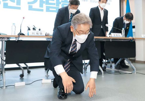 민주당 이재명 대선 후보가 당사에서 24일 열린 민생·개혁 입법 추진 간담회에서 갑자기 카메라 앞으로 가서 무릎을 꿇고 큰절을 하며 “대선 후보로서 국민의 아픈 마음과 어려움을 더 예민하고 신속하게 책임지지 못했으니 사죄의 절을 드리겠다”고 했다. 그런데 이 후보는 사죄 큰절을 마치자마자 쟁점 법안들에 대해 야당은 물론 정부와의 협의마저 건너뛰고 강행 처리를 해야 한다고 주장했다.