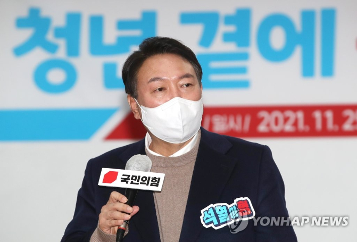 (서울=연합뉴스) 이정훈 기자 = 국민의힘 윤석열 대선 후보가 25일 저녁 서울 관악구 서울대학교 호암교수회관 게스트하우스 로즈홀에서 열린 '국민의힘 서울캠퍼스 총회'에서 인사말을 하고 있다. 2021.11.25 uwg806@yna.co.kr 연합뉴스