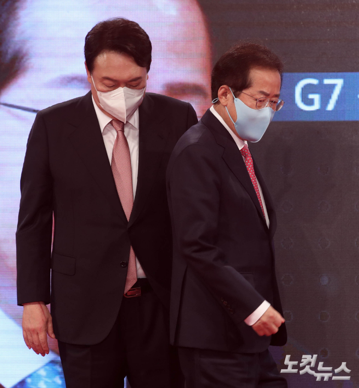 국민의힘 윤석열, 홍준표 대선 경선 후보가 5일 오후 서울 용산구 백범김구기념관에서 열린 제20대 대통령 후보 선출을 위한 2차 전당대회에서 단상에 올라 자리하고 있다. 국회사진취재단