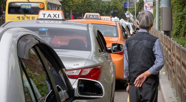 머리가 하얗게 센 택시 운전기사가 손님을 기다리고 있다. /김지호 기자