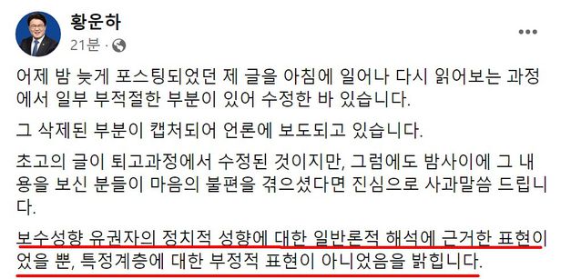 황 의원은 29일 “어제 밤 늦게 포스팅됐던 제 글을 아침에 일어나 다시 읽어보는 과정에서 일부 부적절한 부분이 있어 수정했다”며 “그 삭제된 부분이 캡처되어 언론에 보도되고 있다”고 밝혔다. 그는 “초고의 글이 퇴고 과정에서 수정된 것이지만, 그럼에도 밤사이에 그 내용을 보신 분들이 마음의 불편을 겪으셨다면 진심으로 사과말씀 드린다”며 “보수성향 유권자의 정치적 성향에 대한 일반론적 해석에 근거한 표현이었을 뿐 특정계층에 대한 부정적 표현이 아니었음을 밝힌다”고 했다. 이 사과문의 마지막 문장은 삭제됐다.