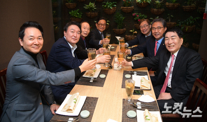 윤석열 국민의힘 대선 후보가 23일 서울 여의도의 한 음식점에서 대선 경선 주자들과의 오찬을 갖으며 물잔 건배를 하고 있다. 왼쪽부터 장성민 세계와동북아평화포럼 이사장, 윤석열 후보, 장기표 신문명정책연구원장, 박찬주 전 육군대장, 최재형 전 감사원장, 박진 의원, 안상수 전 인천시장. 윤창원 기자