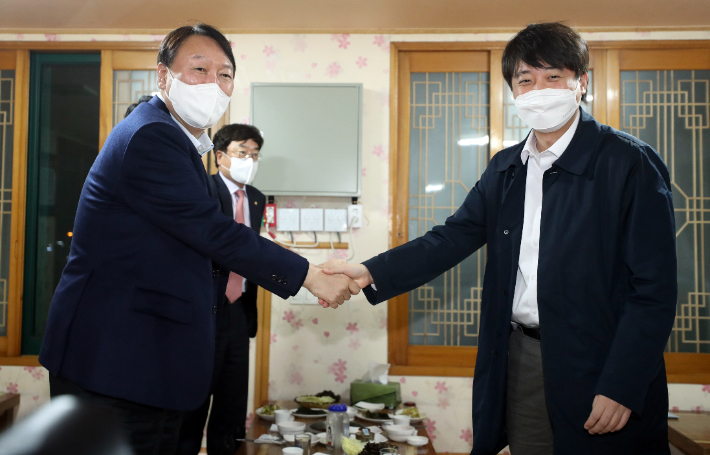 윤석열-이준석, 울산에서 회동 (울산=연합뉴스) 김용태 기자 = 국민의힘 윤석열 대선 후보와 이준석 대표가 3일 울산 울주군의 한 식당에서 만찬 회동을 하고 있다. 2021.12.3 yongtae@yna.co.kr (끝) 연합뉴스