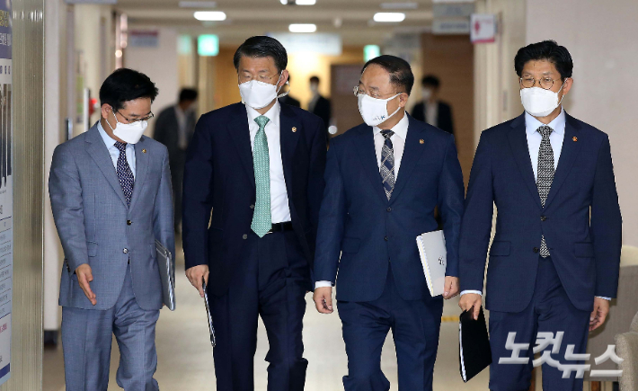 홍남기 경제부총리 겸 기획재정부 장관, 노형욱 국토교통부 장관, 은성수 금융위원장, 김창룡 경찰청장이 28일 부동산 관계부처 합동브리핑을 하기 위해 정부서울청사 브리핑룸으로 향하고 있다. 박종민 기자
