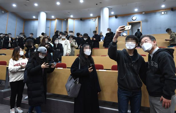 더불어민주당 이재명 대선 후보가 7일 서울 관악구 서울대에서 열린 서울대학교 금융경제세미나 초청 강연회에 참석해 '청년살롱 이재명의 경제이야기' 경제정책 기조와 철학을 주제로 강연을 한 뒤 학생들과 기념촬영을 하고 있다. /연합뉴스
