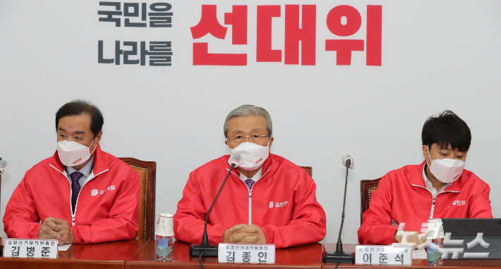 국민의힘 김종인 총괄선거대책위원장이 9일 오전 국회에서 열린 중앙선거대책위원회의에서 모두발언을 하고 있다. 윤창원 기자
