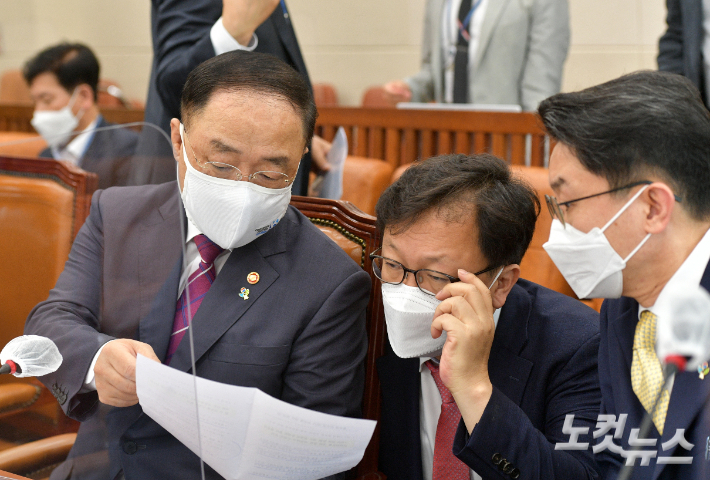 홍남기 경제부총리가 23일 국회에서 열린 기획재정위 전체회의에 출석해 회의 시작에 앞서 이억원 기재부 1차관 등 기재부 관계자와 이야기를 나누고 있다. 윤창원 기자