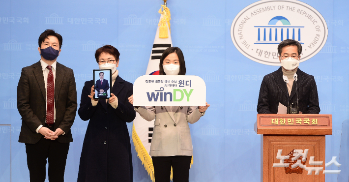 김동연 새로운물결 대선 후보가 7일 오전 서울 여의도 국회 소통관에서 기자회견을 열고 자신의 AI아바타 윈디(winDY)를 소개하고 있다. 박종민 기자